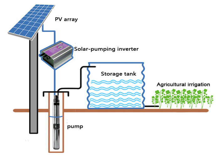 The solar water pumping system is a stand-alone system operating on power generated using solar PV (photovoltaic) system. From irrigation of fields to remote home or village water supply, solar water pumps are well suited and proven to meet water pumping needs, using solar energy.The solar water pumping system is a stand-alone system operating on power generated using solar PV (photovoltaic) system. The power generated by solar cells is used for operating a submersible pump for lifting water from bore/open well or water reservoir. We offer an assortment of high performing solar water pumping systems that are specially designed to technical perfection in order to facilitate pumping solutions in a number of applications areas.